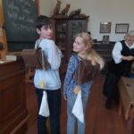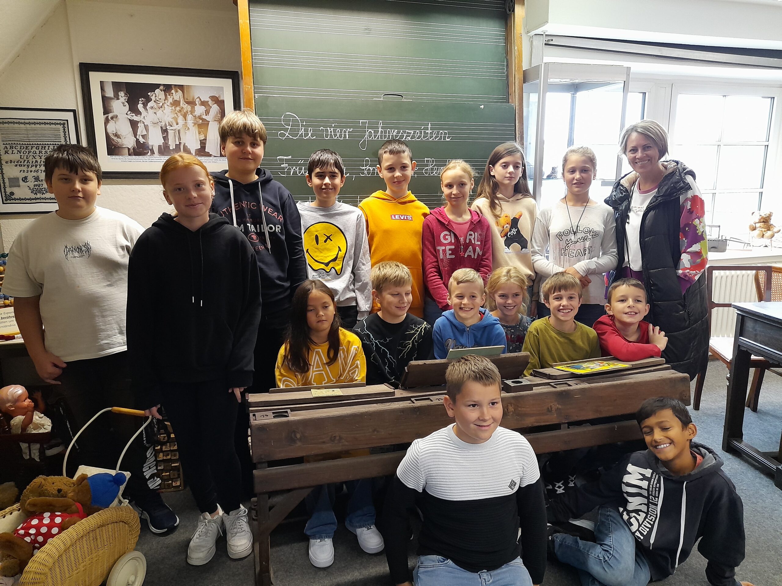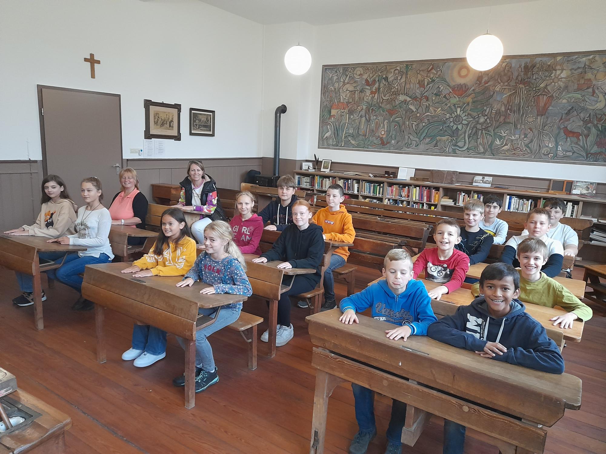 Die Kinder durften in den historischen Bänken Platz nehmen, alte Schiefertafeln ausprobieren und erfuhren, welche Regeln damals im Klassenzimmer galten. Besonders beeindruckend war der direkte Vergleich: Während wir heute mit modernen Heften, Büchern und digitalen Medien arbeiten, mussten die Kinder früher oft mit wenig Material auskommen und sehr streng nach Vorschriften lernen.